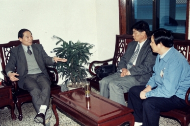 Xu Hui, director of the Haining Municipal People's Congress Standing Committee (when he was the executive deputy mayor of Haining City), accompanied by Mr. Cha Jimin, a Hong Kong industrialist who visited the company, was in Hongda Warp Industrial Company.
