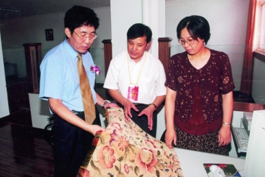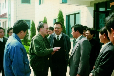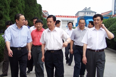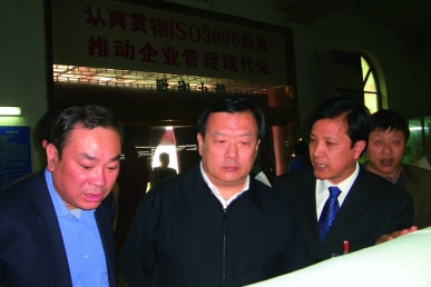 The former deputy minister of the Ministry of Personnel and the then governor of Zhejiang Province Wan Xueyuan (second from left) and other leaders in the guidance of Zhejiang Hongda Warp Knitting Co., Ltd.