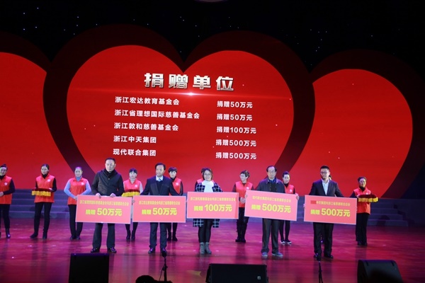 1月11日晚,由浙江省民政廳、浙江省文化和旅游廳指導,浙江省慈善聯合總會主辦,浙江省慈善聯合總會慈善文化發展研究院承辦的“以慈善的名義”——浙江省慈善聯合總會新春公益答謝晚會上在浙江省音樂廳成功舉辦。浙江省委常委、秘書長陳金彪,浙江省人大常委會副主任趙光君,省人民政府副省長王文序,省政協副主席、黨組副書記孫景淼,十一屆省政協副主席、黨組副書記、省慈善聯合總會會長、慈善文化發展研究院院長陳加元,九屆省政協副主席王玉娣,十屆省政協副主席盛昌黎,十屆、十一屆省政協副主席陳艷華,浙江省民政廳廳長王劍侯、文化和旅游廳廳長褚子育等領導出席晚會。會上,宏達控股集團董事長沈國甫代表浙江宏達教育基金會向浙江省慈善協會捐款50萬元。