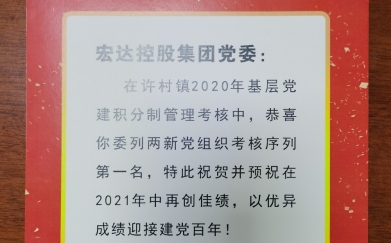 宏達控股集團黨委在許村鎮(zhèn)2020年度基層黨建積分制管理考核中委列兩新組織..